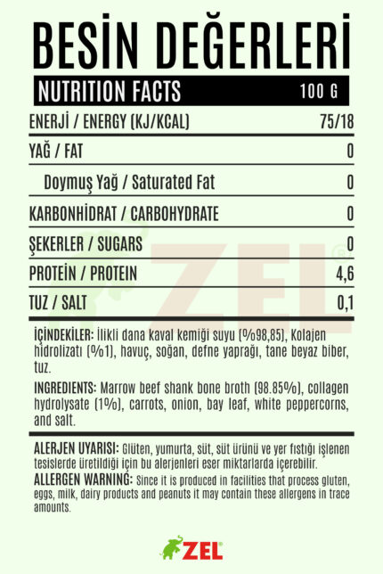 Uzun süre kaynatılarak elde edilen ilikli dana kemik suyu, kolajen hidrolizatı ilavesiyle zenginleştirilmiş sade ve yoğun bir lezzet sunar. Yağ, karbonhidrat ve şeker içermeyen yapısıyla hafif bir tüketim alternatifi olarak öne çıkar. Tek başına içilebilir ya da çorba ve yemek tariflerinde doğal bir baz olarak kullanılabilir. 480 ml cam kavanoz ambalajı sayesinde pratik kullanım sağlar. Yerli üretimdir, hijyenik koşullarda hazırlanmıştır.