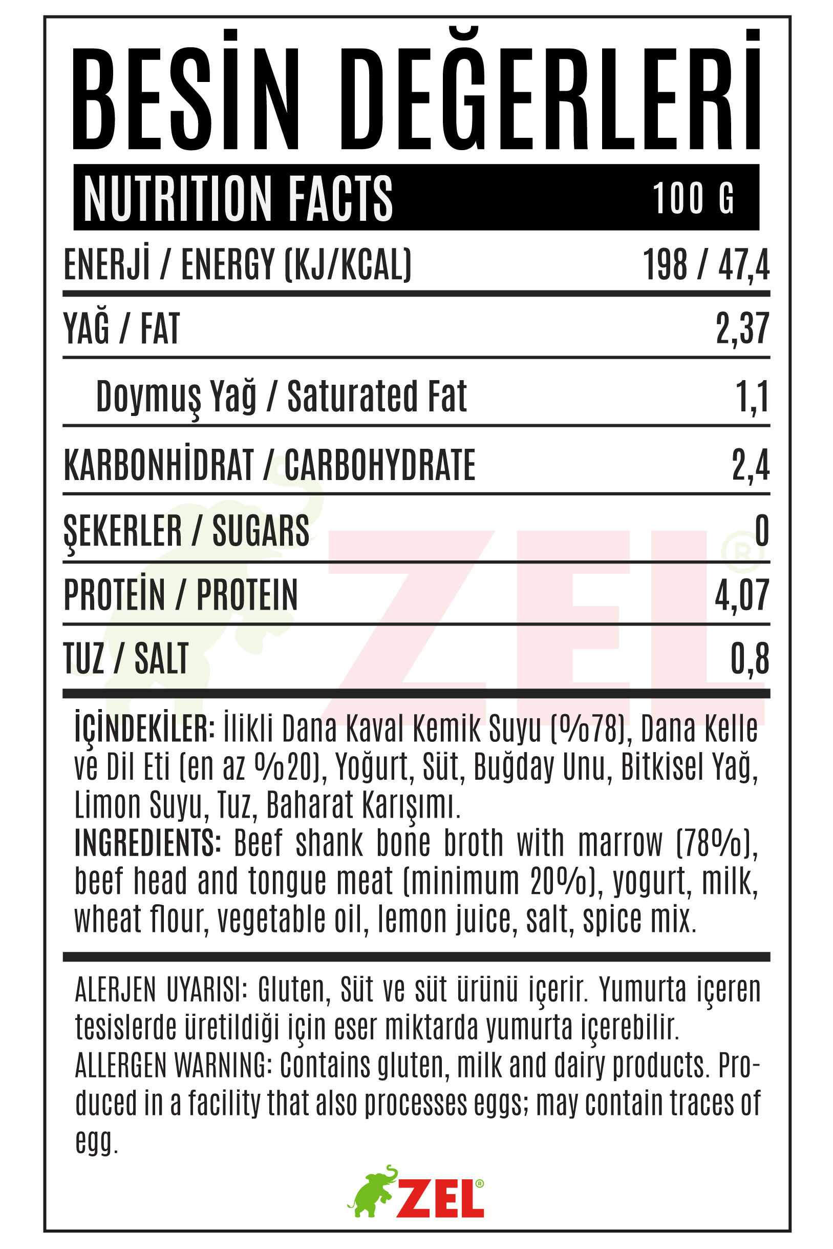 Dana incik kemik suyu (%78), dana kafa ve dil eti (en az %20), yoğurt, süt, buğday unu, bitkisel yağ, limon suyu, tuz, baharat karışımı.