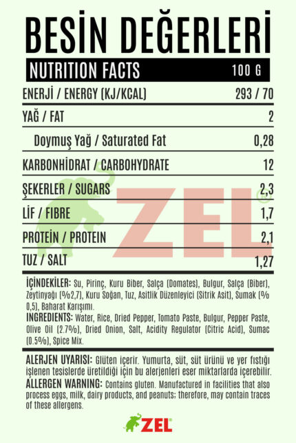 Enerji: 697.19 kj / 166.52 kcal; Yağ: 8.64 g (Doymuş Yağ: 2.6 g); Karbonhidrat: 7.29 g (Şeker: 0.0 g); Protein: 16.9 g; Tuz: 1.12 g