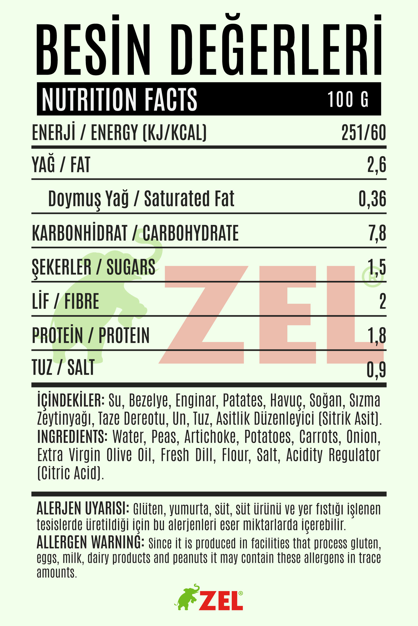 Su, bezelye, enginar, patates, havuç, soğan, sızma zeytinyağı, taze dereotu, un, tuz, asitlik düzenleyici (sitrik asit).