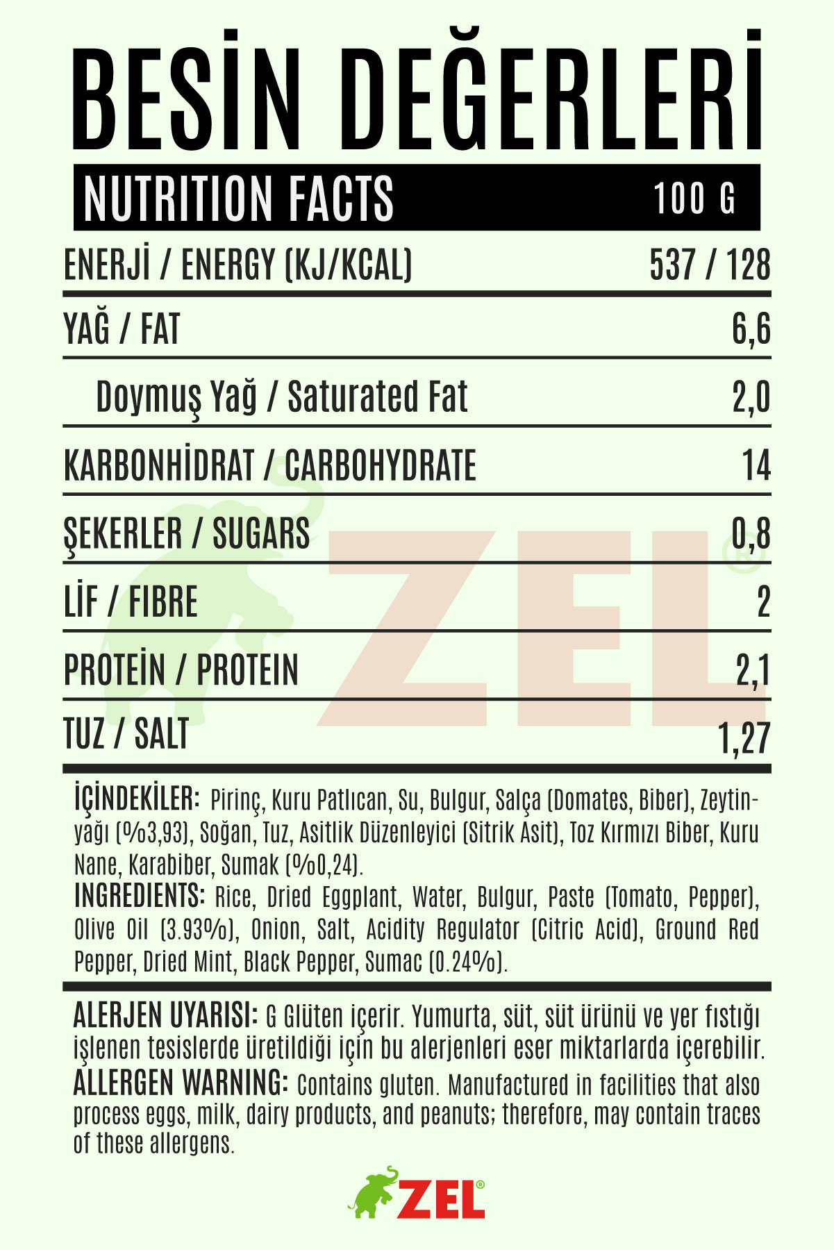 Su, Pirinç, Domates Salçası, Kuru Patlıcan, Bulgur, Sumak, Kırmızı Biber Salçası, Bitkisel Yağ (Zeytinyağı), Soğan, Tuz, Asitlik Düzenleyici (Sitrik Asit), Baharat Karışımı.